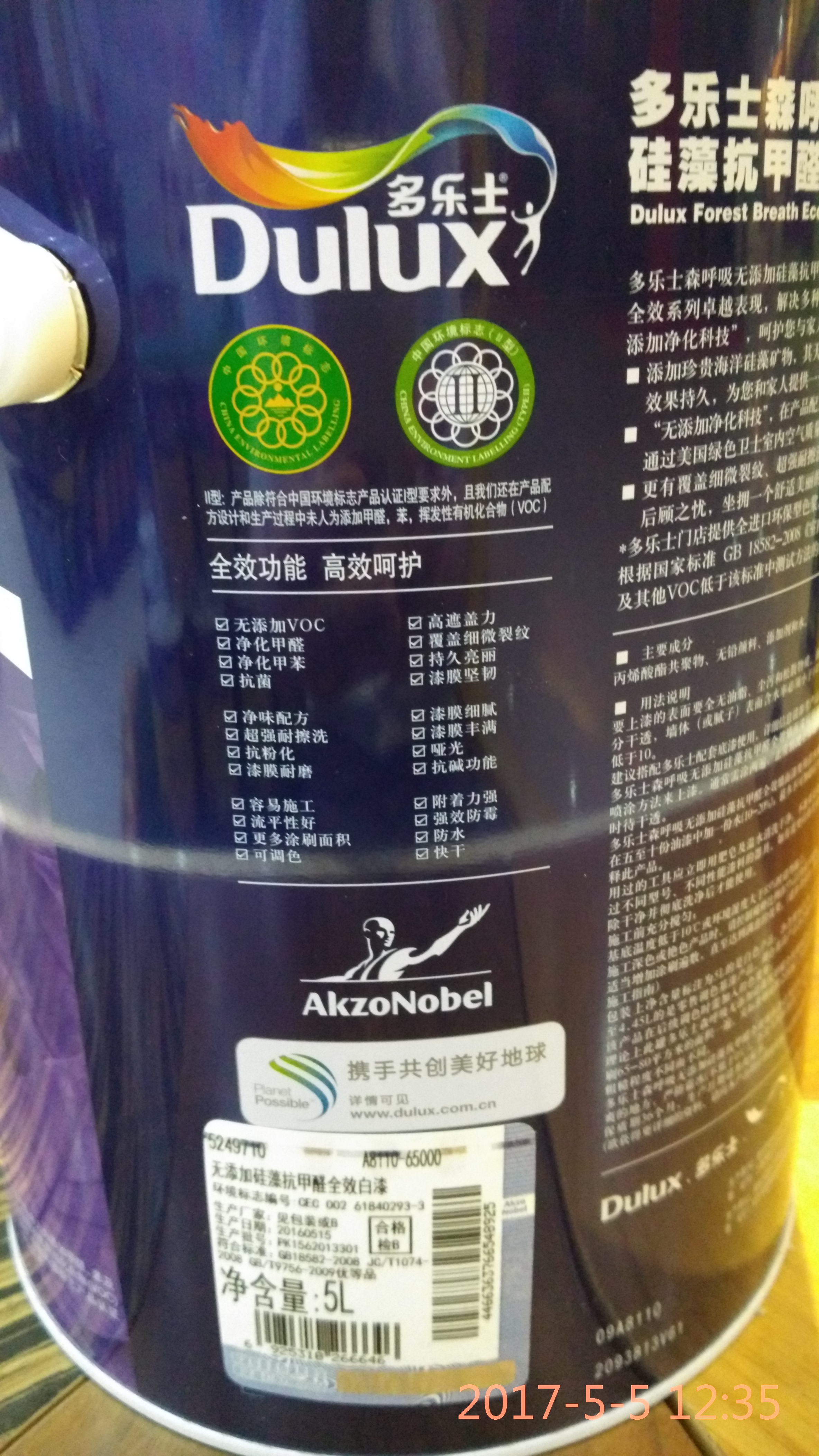 多乐士硅藻森呼吸全效无添加墙面漆,5L/桶