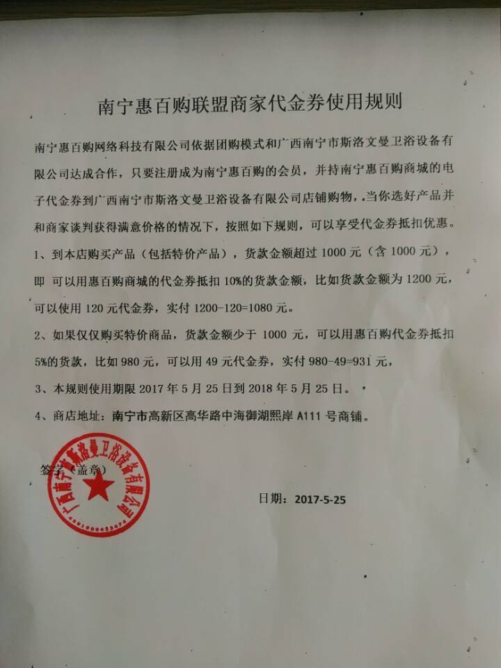 南宁惠百购联盟商家代金券使用规则 南宁惠百购网络科技有限公司依据团购模式和广西南宁市斯洛文曼卫浴设备有限公司达...详情介绍>>